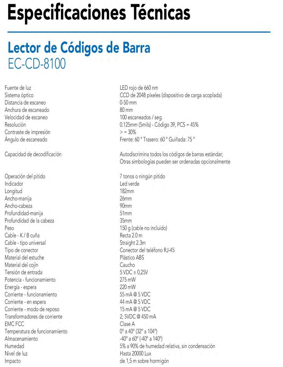 Lector De Código De Barras EC-CD-8100-USB / Alámbrico / 1D / PS2, USB / Incluye Cable USB / Color Negro