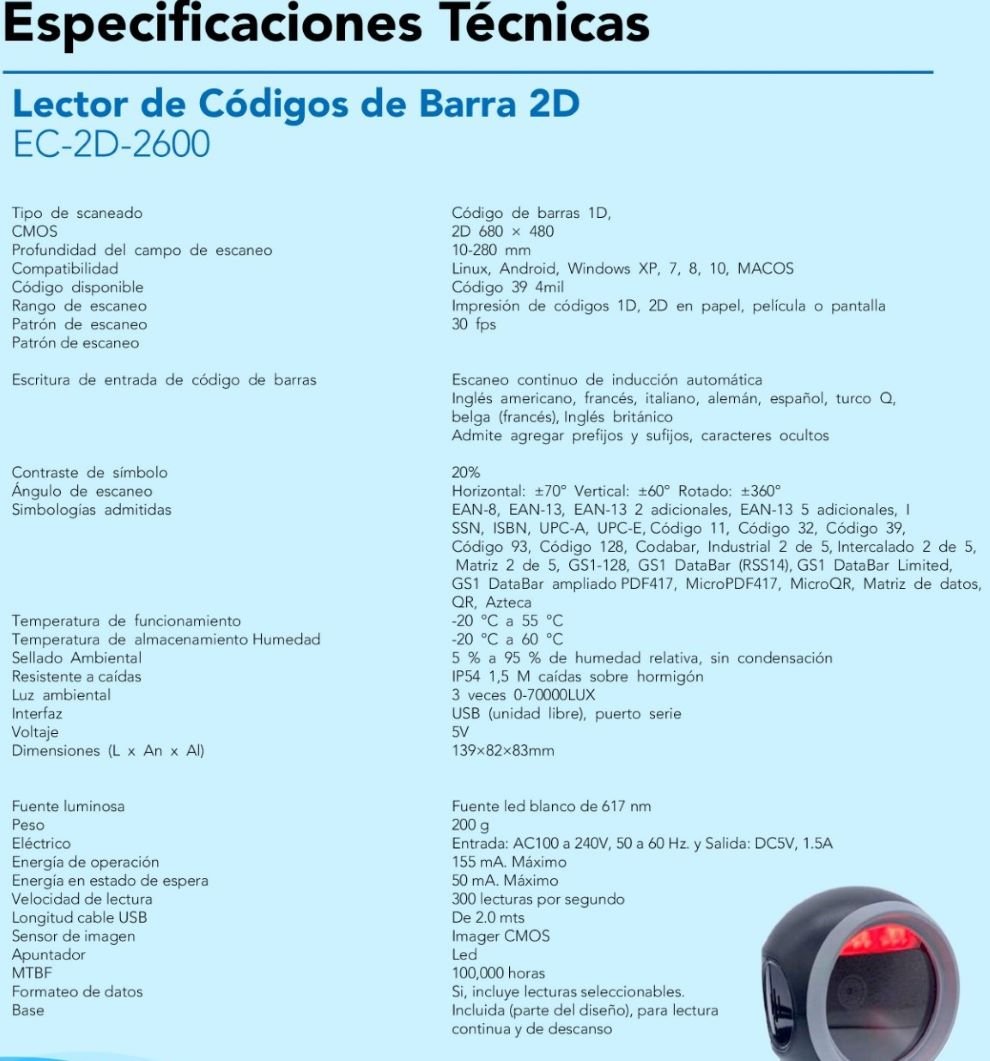 Sé el primero en valorar “Lector De Código De Barras EC LINE EC-2D-2600 / Censor CMOS / 1D, 2D / USB, Serial / Incluye Cable USB / Color Negro”