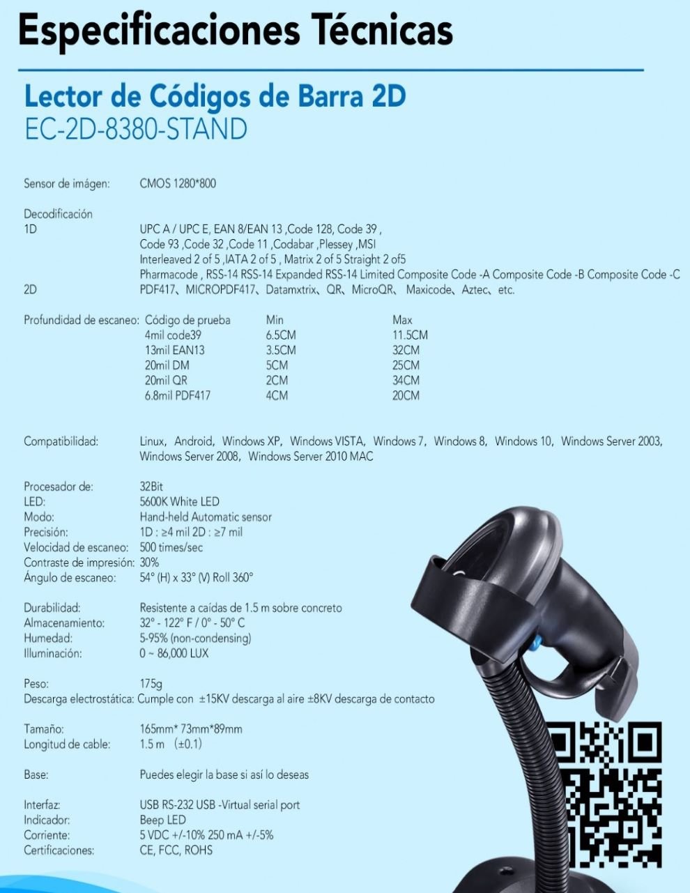 El lector de código de barras láser EC Line EC-2D-8380 es un dispositivo alámbrico que cuenta con una altura de 89 mm y una longitud de cable de 1.5 m. Este lector utiliza tecnología láser para escanear tanto códigos de barras lineales (1D) como códigos bidimensionales (2D).