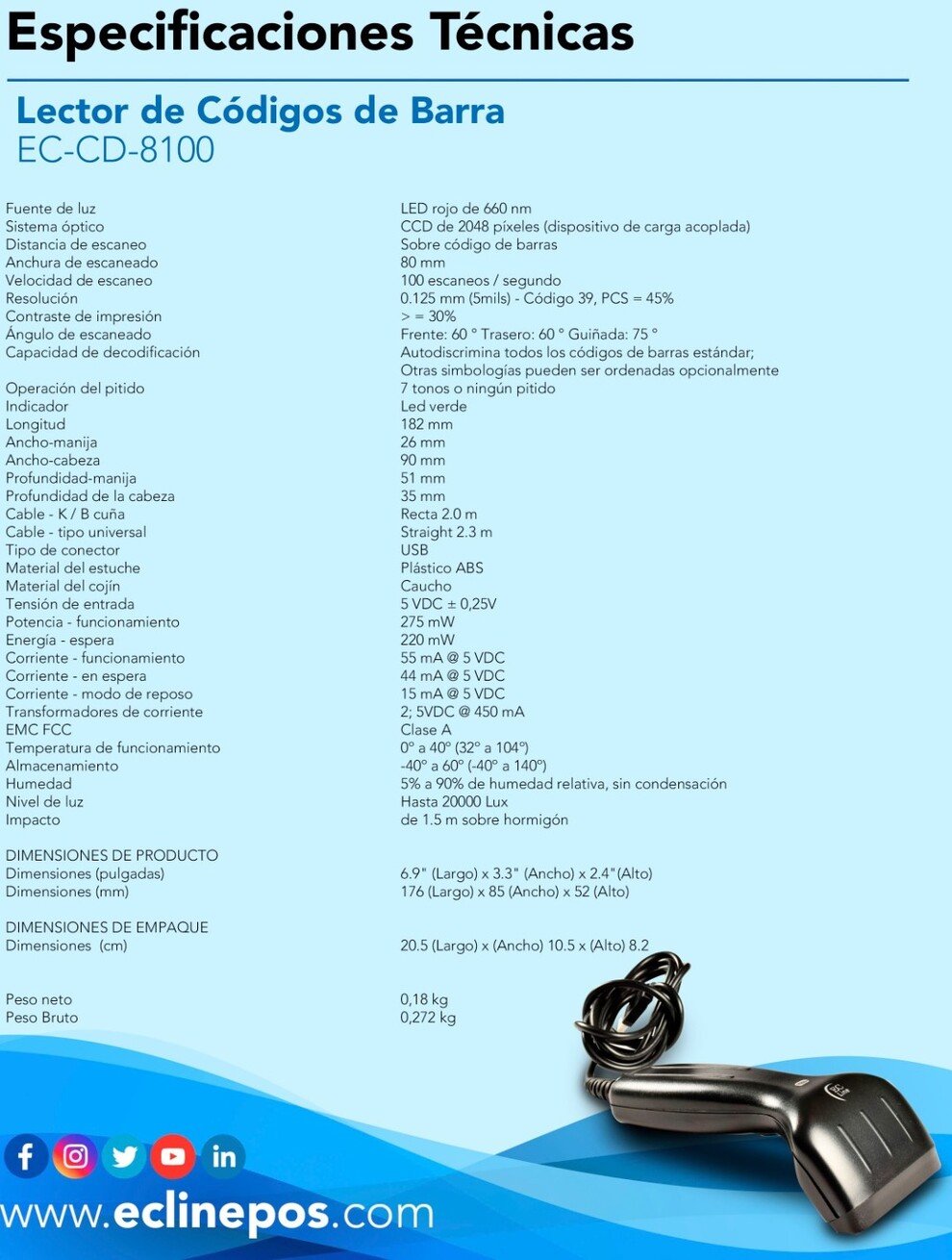 Lector de Código de barra EC-CD-8100 diseño ergonómico especializado para pequeños Comercios. Su diseño lo hace ser un lector funcional y de bajo consumo de energía.