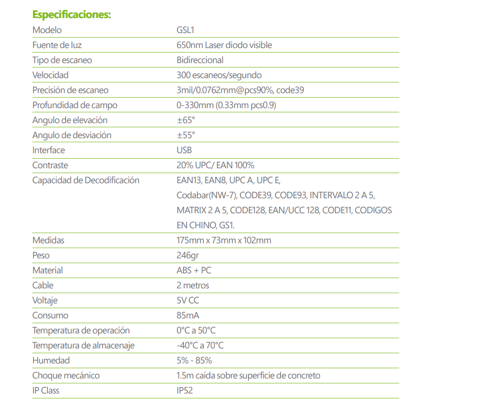 • Códigos compatibles: EAN13, EAN8, UPC A, UPC E, CODABAR(NW-7), CODE39, CODE93, INTERVALO 2 A 5, MATRIX 2 A 5, CODE128, EAN/UCC 128, CODE11, CÓDIGOS EN CHINO, GS1.