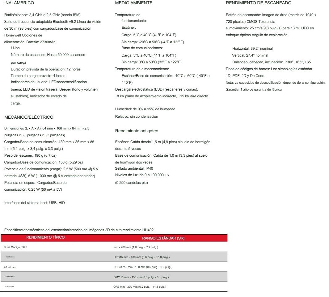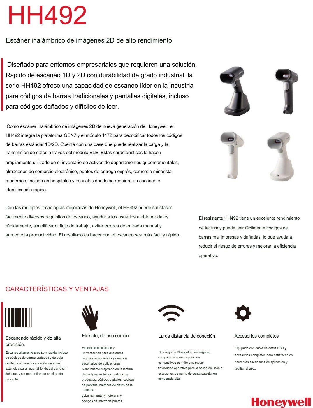 Lector De Código De Barras HONEYWELL HH492 / Inalámbrico / Bluetooth / LED / 1D, 2D / Incluye Cable USB Y Base / Color Negro