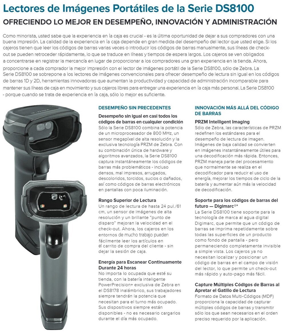 Lector De Código De Barras ZEBRA DS8178-SR7U2100SFW / Inalámbrico / 1D, 2D / Conexión USB Y Base Incluidos / Bluetooth / Alcance De Escaneo 61 CM / Color Negro