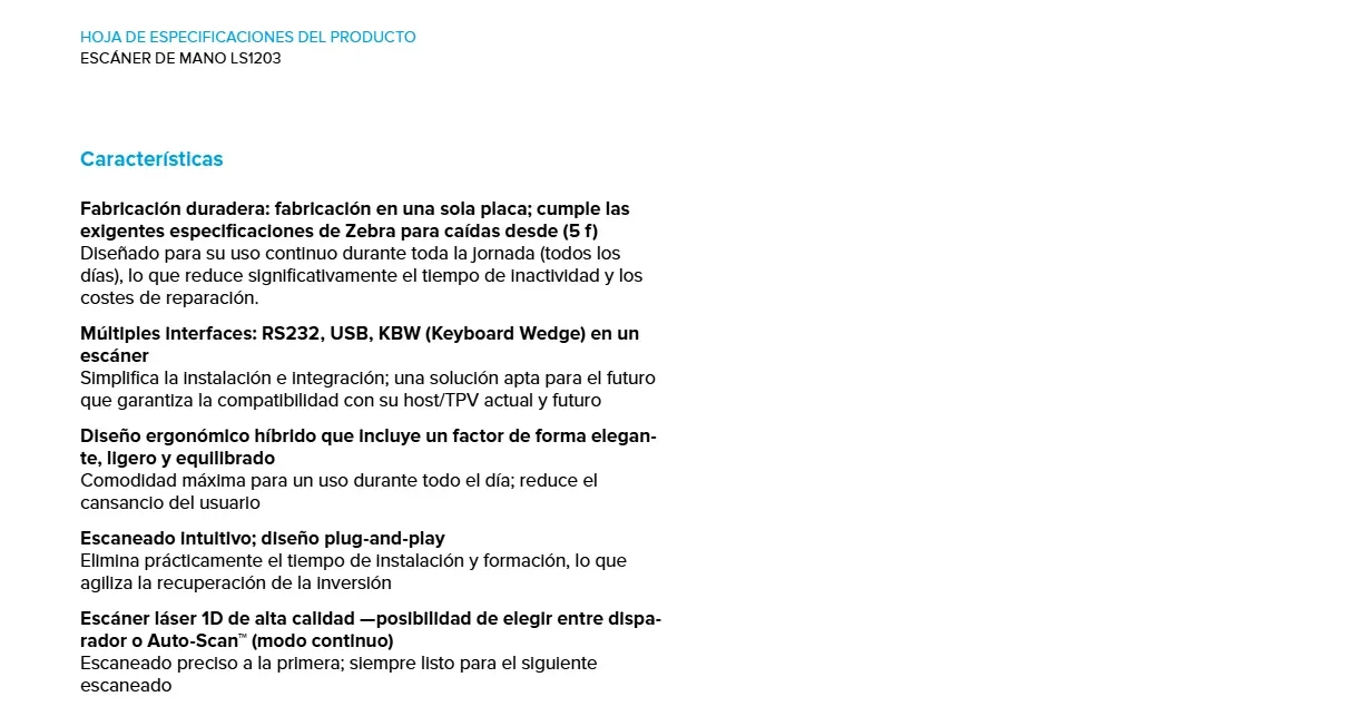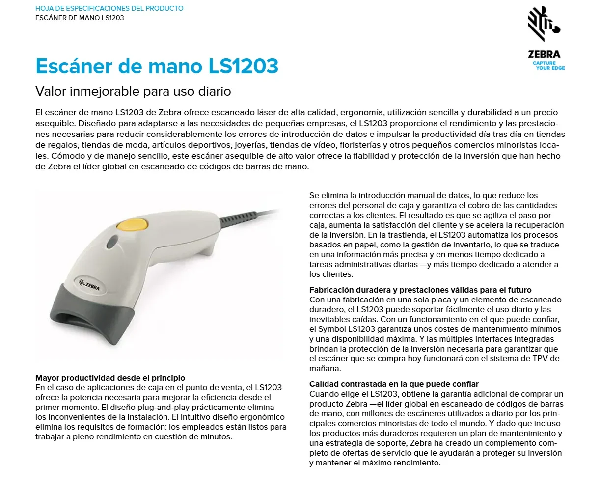 Lector De Código De Barras ZEBRA LS1203 / Alámbrico / 1D / USB, RS-232 / Base Incluida / Negro
