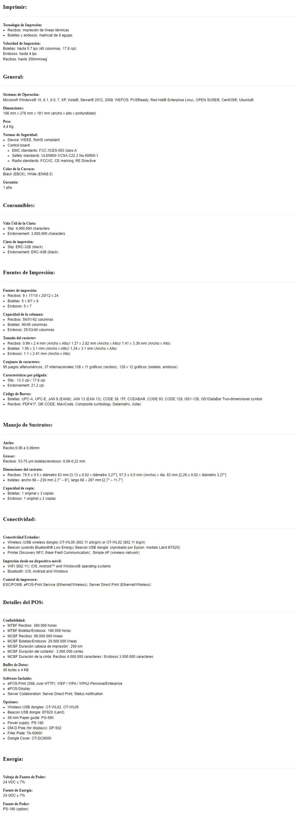 Mini Impresora Térmica EPSON TM-H6000V / Híbrida / USB, Ethernet, RS-232, NFC / 350 mm, 5.7 Líneas/s, 4 Ips / Negro