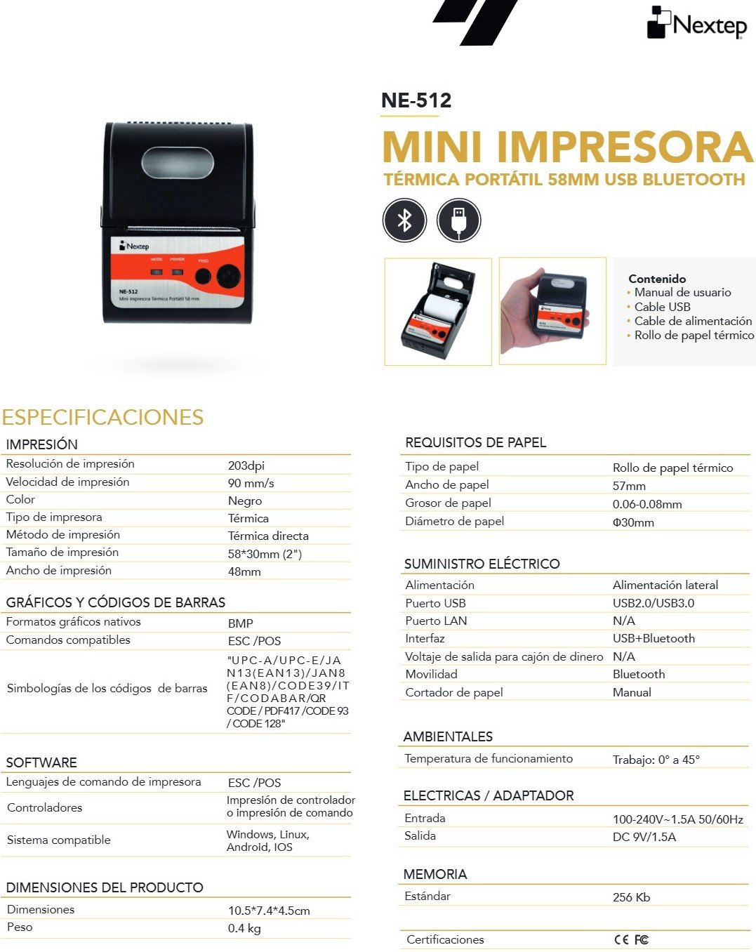 Mini Impresora Térmica NEXTEP NE-512 / USB, Bluetooth / 58 Mm / 203dpi / Negro