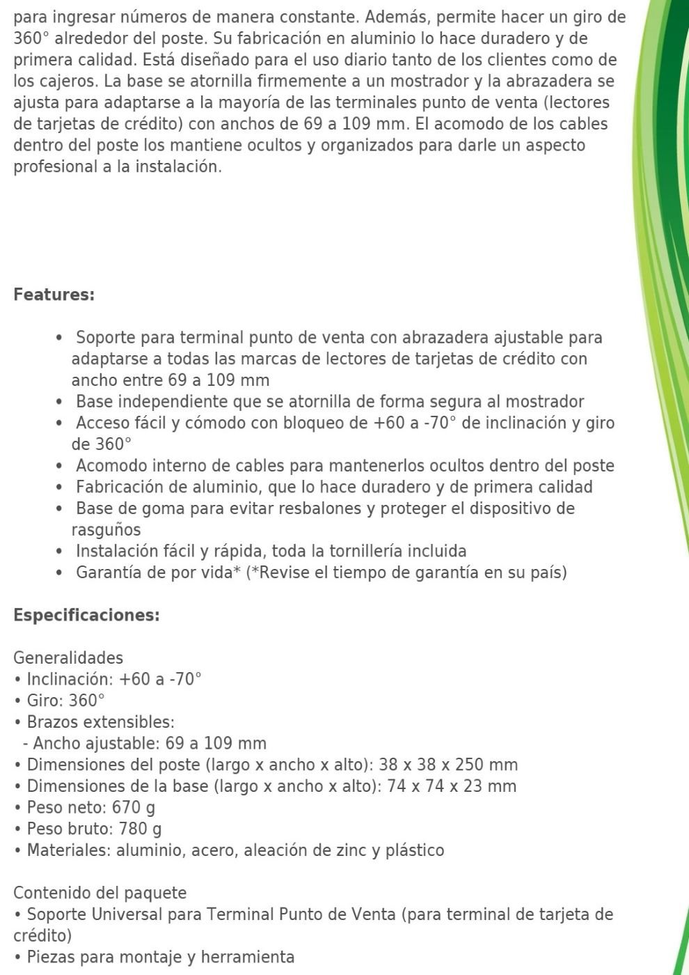 Monta de forma segura tu lector de tarjetas de crédito en un mostrador con el soporte universal para terminal punto de venta (POS) de Manhattan. Ofrece fácil acceso al teclado para introducir el NIP y al lector de chip de tarjeta, con una inclinación de + 60 ° a -70°, que se puede bloquear en una posición fija, para ingresar números de manera constante. Además, permite hacer un giro de 360° alrededor del poste. Su fabricación en aluminio lo hace duradero y de primera calidad. Está diseñado para el uso diario tanto de los clientes como de los cajeros