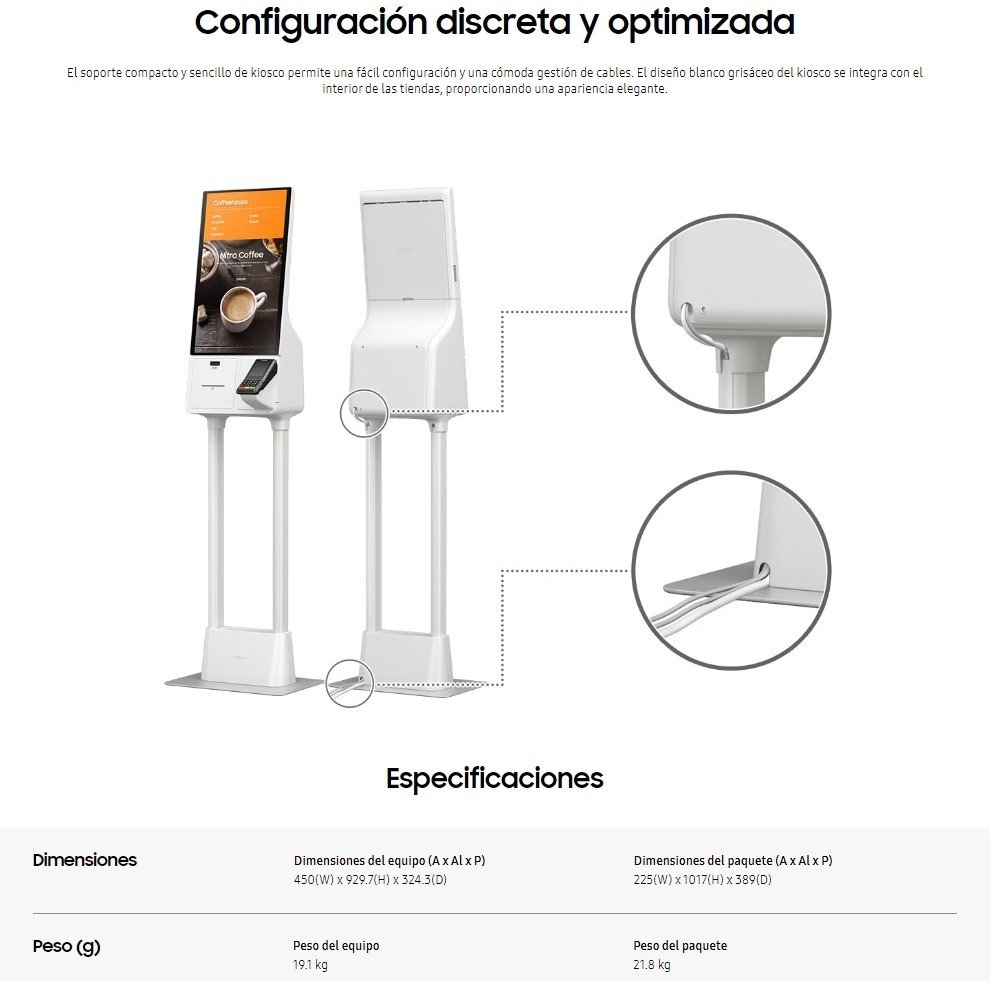 El soporte compacto y sencillo de kiosco permite una fácil configuración y una cómoda gestión de cables. El diseño blanco grisáceo del kiosco se integra con el interior de las tiendas, proporcionando una apariencia elegante.