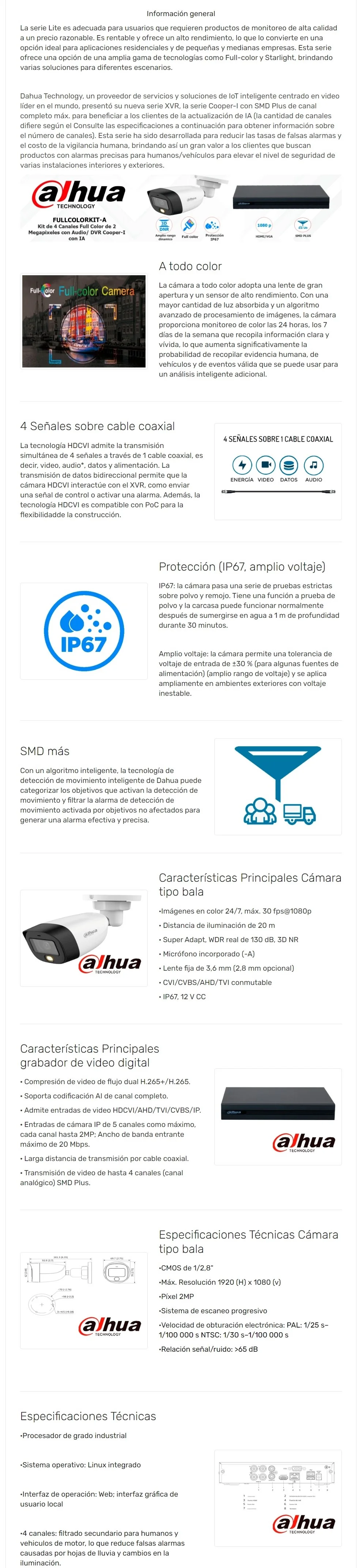 Kit de 4 Cámaras Full Color de 2 Megapíxeles Con Micrófono DAHUA / DVR Cooper-I WizSense Con IA / 4 Ch + 1 IP/ 4 Ch SMD Plus / Búsqueda de Humanos y Autos