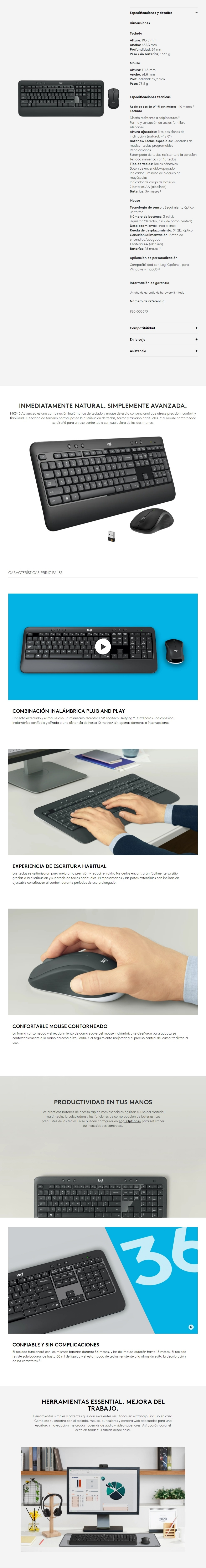 MK540 Advanced es una combinación inalámbrica de teclado y mouse que ofrece precisión, confort y confiabilidad.