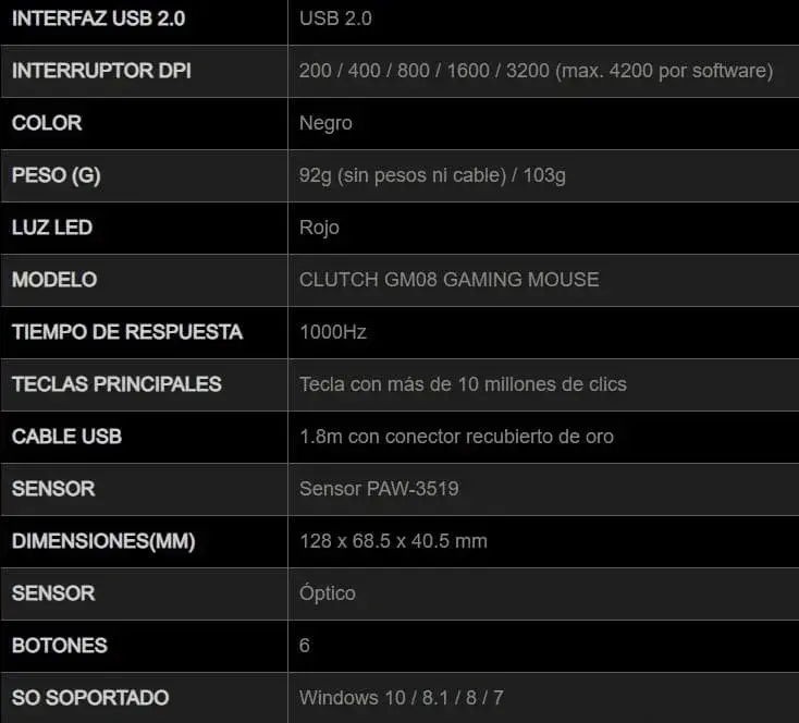 DPI predeterminado hasta 3200 por hardware, DPI máximo de hasta 4200 por software