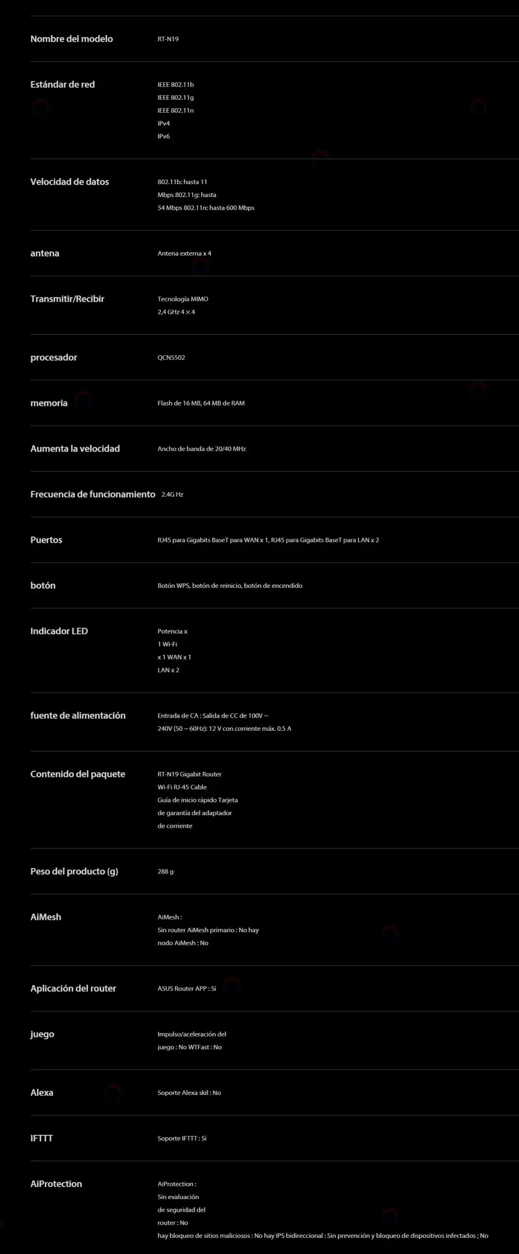 Router ASUS Ethernet Firewall Rt-N19 / 600MBIT/S / 2XRJ-45 / 2.4GHZ / 4 Antenas / Negro