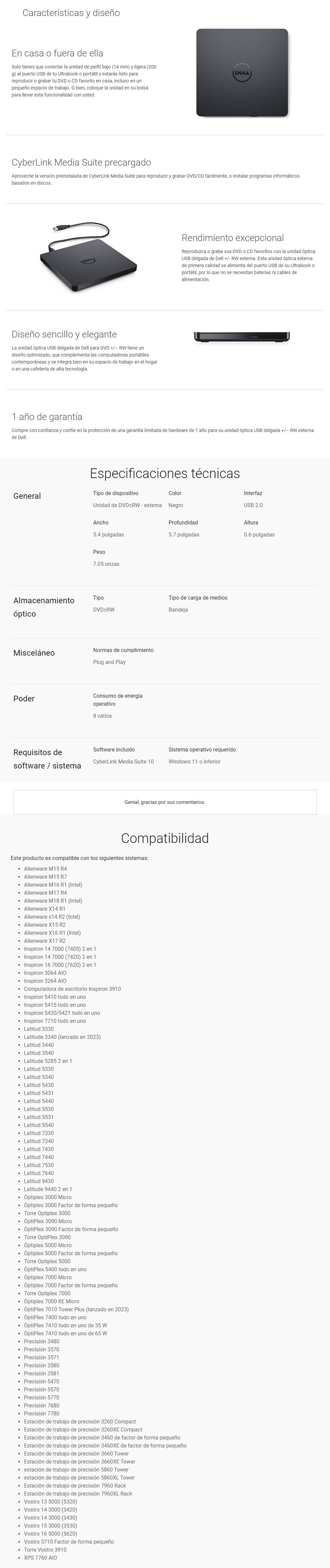La unidad óptica USB delgada de Dell para DVD +/-RW es una solución de grabación y reproducción de discos plug and play que puede usar con un puerto USB.
