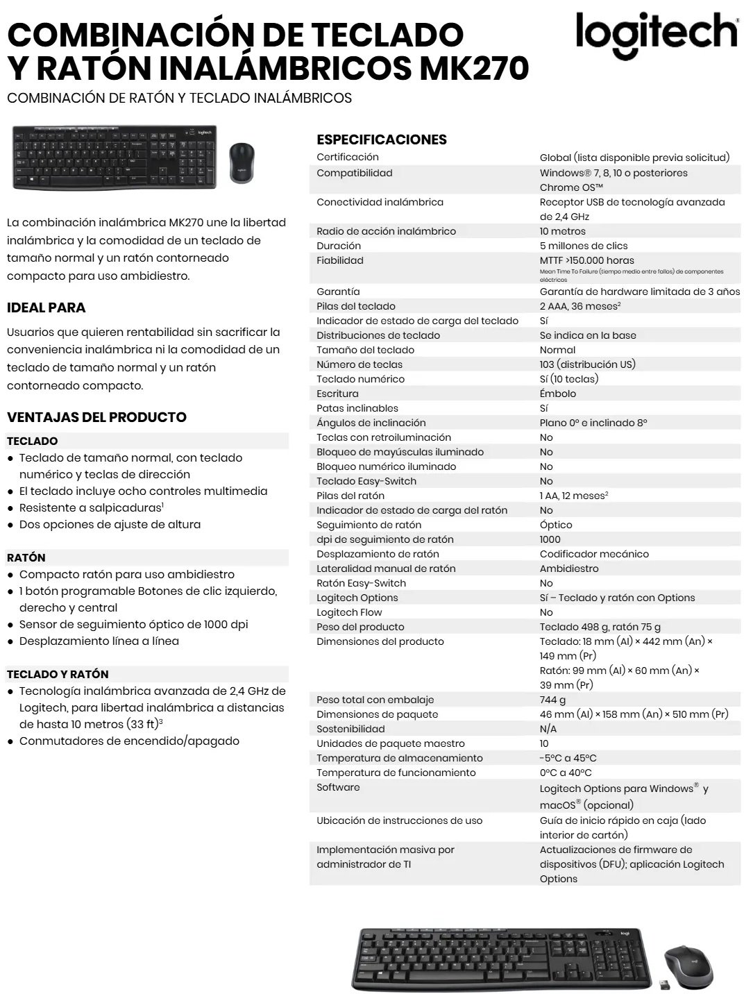 • La combinación inalámbrica MK270 combina la conveniencia y el confort de un teclado de tamaño normal con un compacto mouse contorneado.