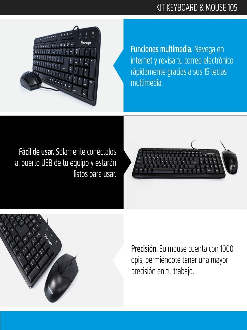 Kit De Teclado Y Mouse VORAGO KM-105 / Membrana / Alámbrico / USB / Cable 1.5m / Teclas Multimedia / 1000Dpi / 2 Botones / Español / Negro