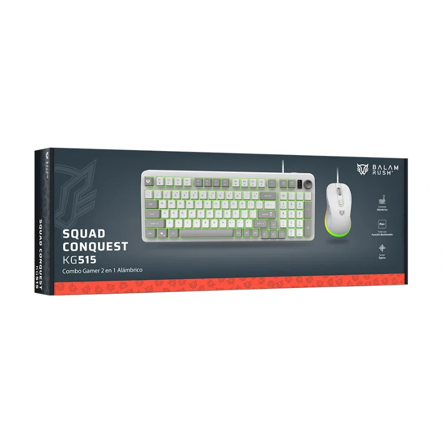 Kit Teclado y Mouse Gamer BALAM RUSH Squad Conquest KG515 – Alámbrico, USB, Membrana, Anti-ghosting, Hasta 7,200Dpi, Teclas Multimedia – Blanco