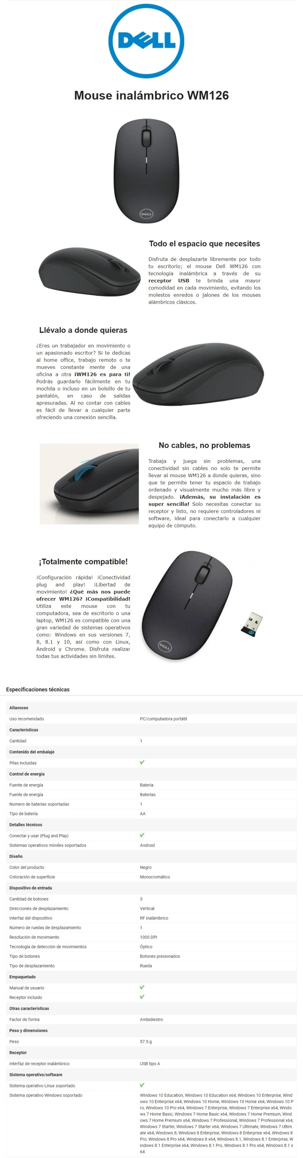 Sé el primero en valorar “Mouse DELL WM126 / 1000 Dpi / 3 Botones / Receptor Usb / Inalámbrico / Sensor Óptico / Negro”