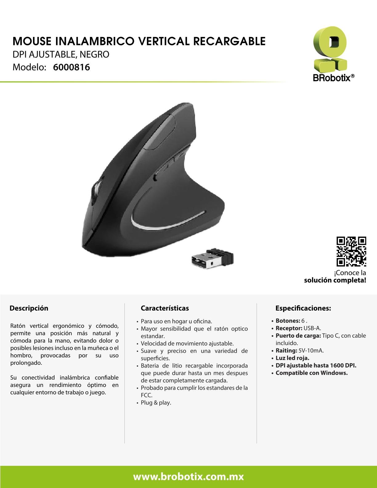 Mouse Ergonómico BROBOTIX 6000816 – Inalámbrico Nano USB, Óptico, 1600DPI, RF Inalámbrico, 6 Botones, Batería Recargable, Color Negro
