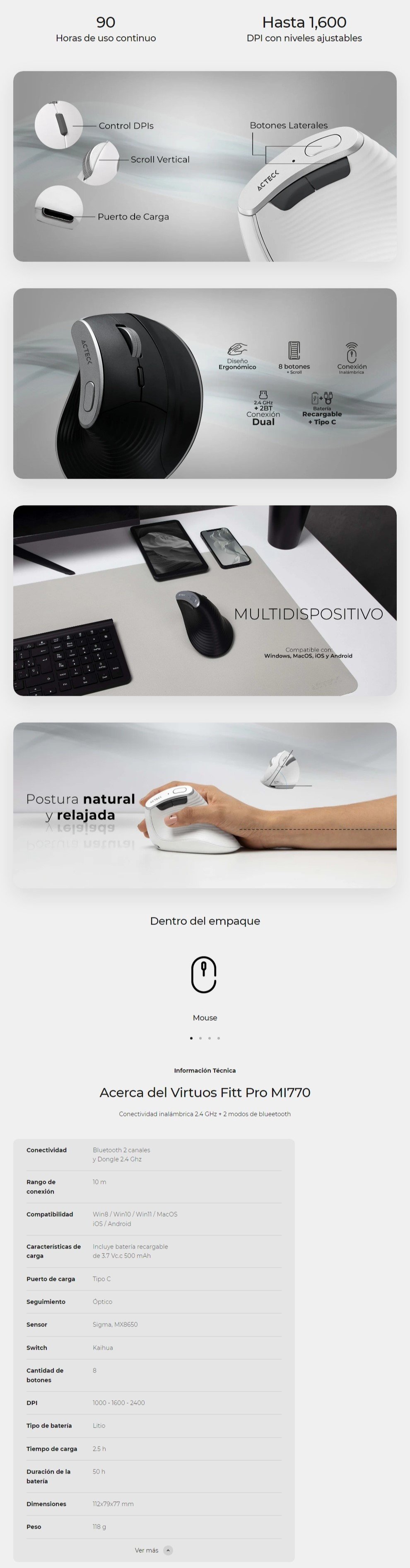 Mouse Ergonómico Profesional ACTECK VIRTUOS FITT PRO MI770 / 2400 Dpi Ajustables / 8 Botones / Inalámbrico / USB-C / Para Oficina / Multidispositivo / Sensor Sigma / Negro