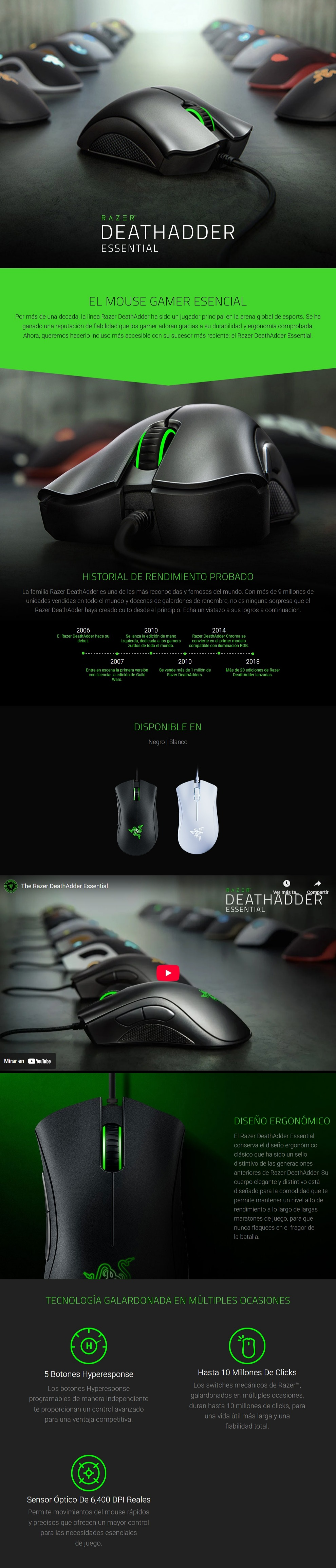 Por más de una decada, la línea Razer DeathAdder ha sido un jugador principal en la arena global de esports. Se ha ganado una reputación de fiabilidad que los gamer adoran gracias a su durabilidad y ergonomía comprobada. Ahora, queremos hacerlo incluso más accesible con su sucesor más reciente: el Razer DeathAdder Essential.