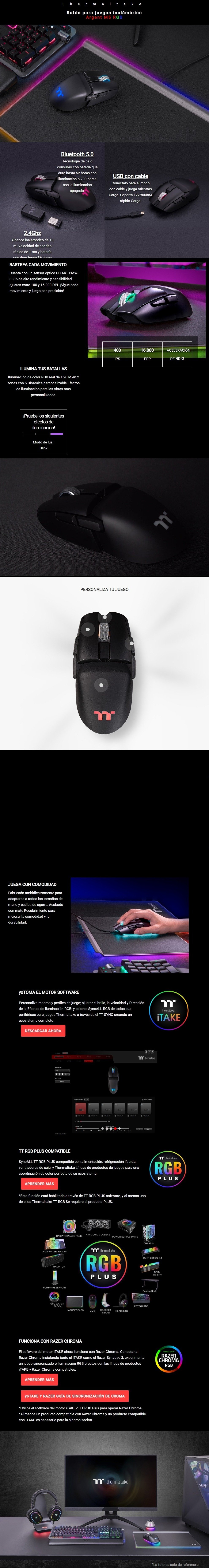 Mouse Gamer THERMALTAKE ARGENT M5 WIRELESS RGB / Inalámbrico / 16000 DPI / 8 Botones Personalizables / Ambidiestro / Sensor pixart PMW-3335 / Negro