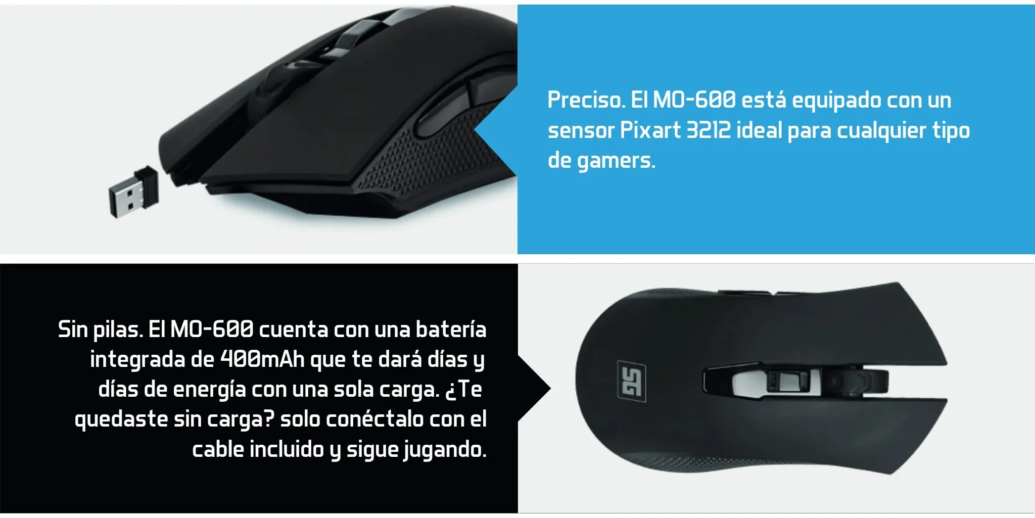 El MO-600 cuenta con dos baterías de litio recargables de 200mAh que te darán batería para jugar sin necesidad de cables. ¿Te quedaste sin carga? solo conéctalo con el cable incluido y sigue jugando.
