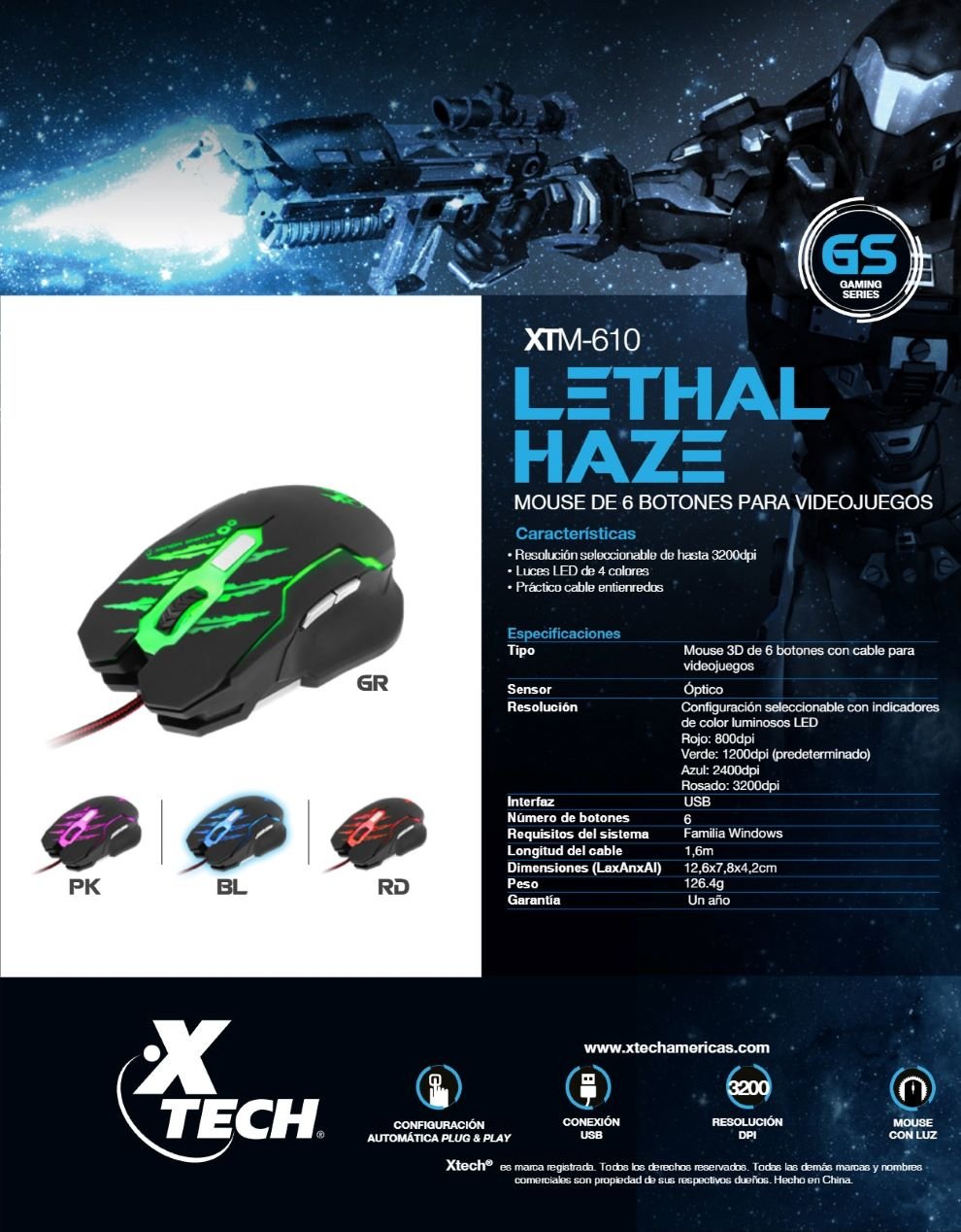 Mouse Gamer XTECH Lethal Haze XTM-610 / 3200 DPI Ajustables / 6 Botones / Alámbrico / USB / Cable 1.6 Mts. / Sensor Óptico / LED 4 Colores / Color Negro