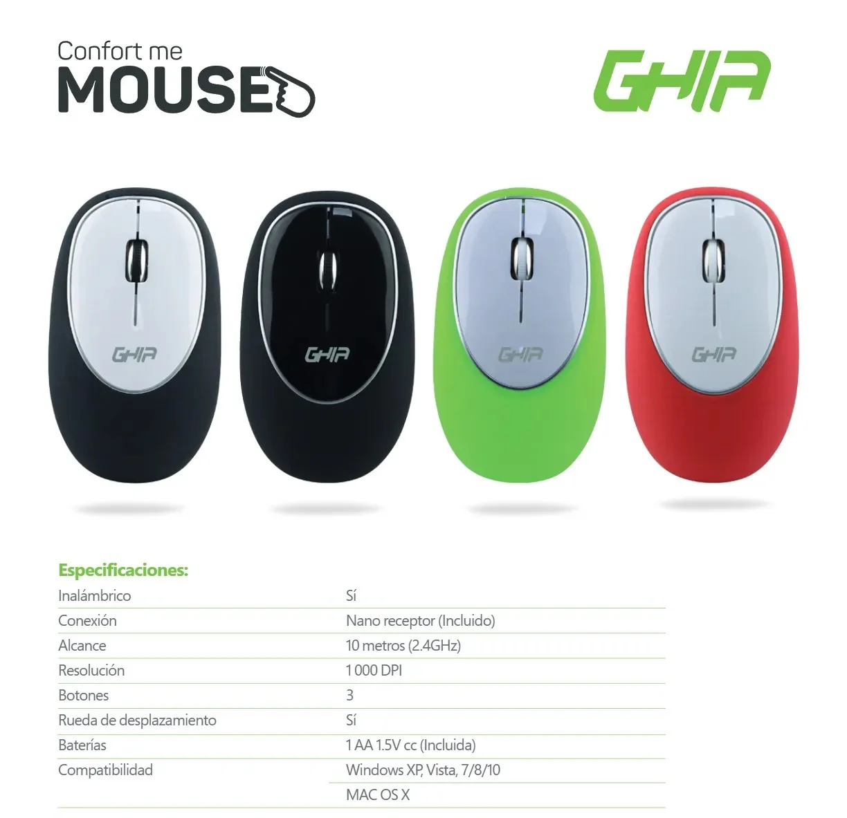 • Además, el Mouse Ghia tiene una rueda para desplazamiento vertical y tres botones presionados. Su alcance inalámbrico es de hasta 10 metros, lo que permite su uso en viajes o lugares donde se requiere movilidad.