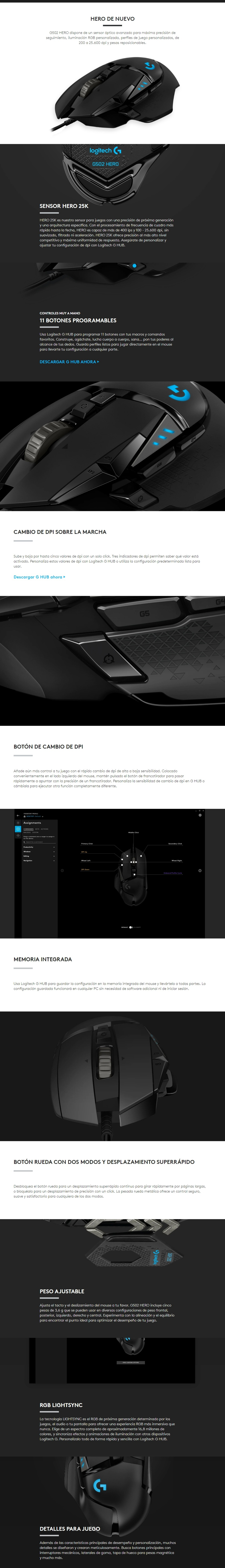 Mouse Logitech Gaming G502 Hero Rgb / 100-16000 Dpi / Cinco Pesas 3.6gr / Velocidad De 1 Ms / Sensor Hero / 11 Botones Programables