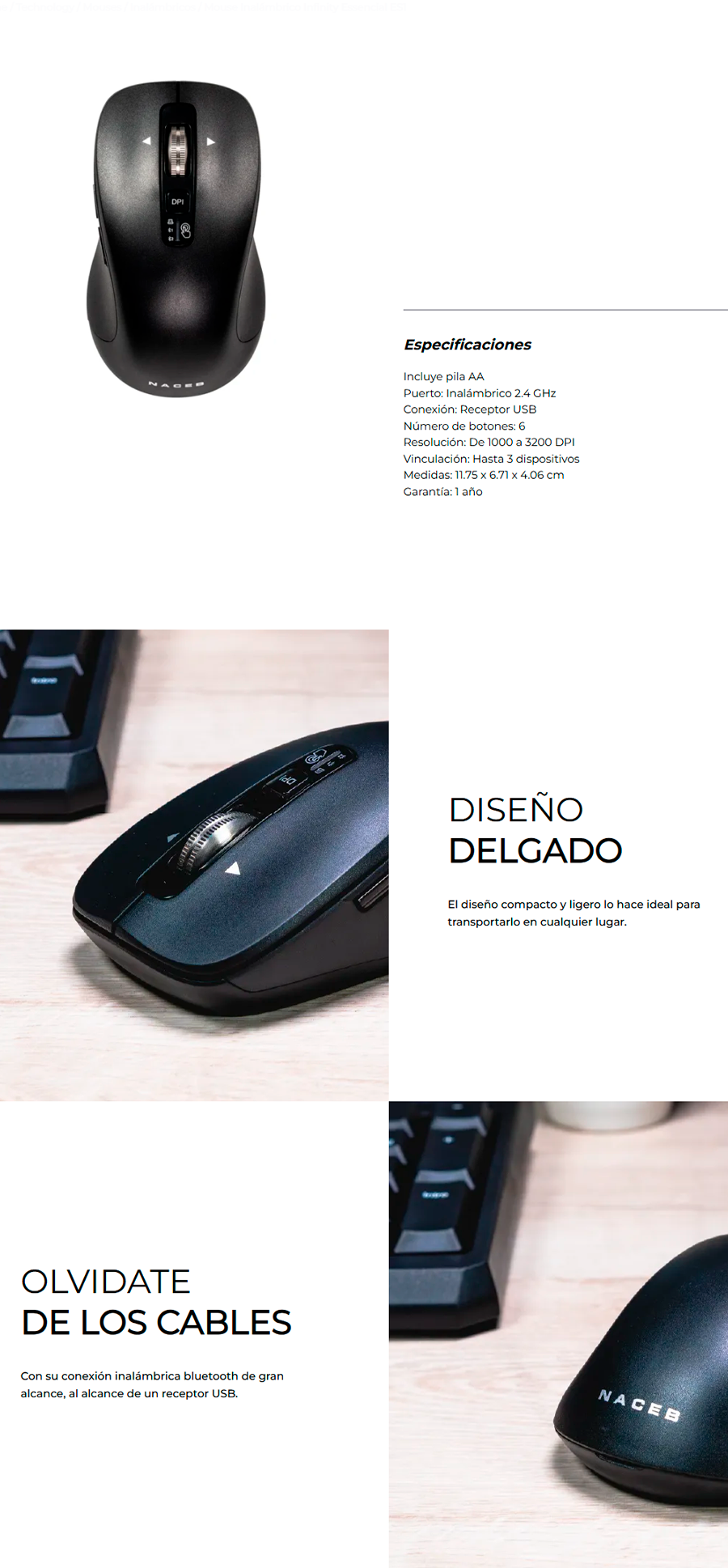 Mouse Naceb Ambidiestro NA-0132 – Inalámbrico, Nano USB Bluetooth, Óptico, 6 Botones, 3200 DPI, Baterías AA, Negro