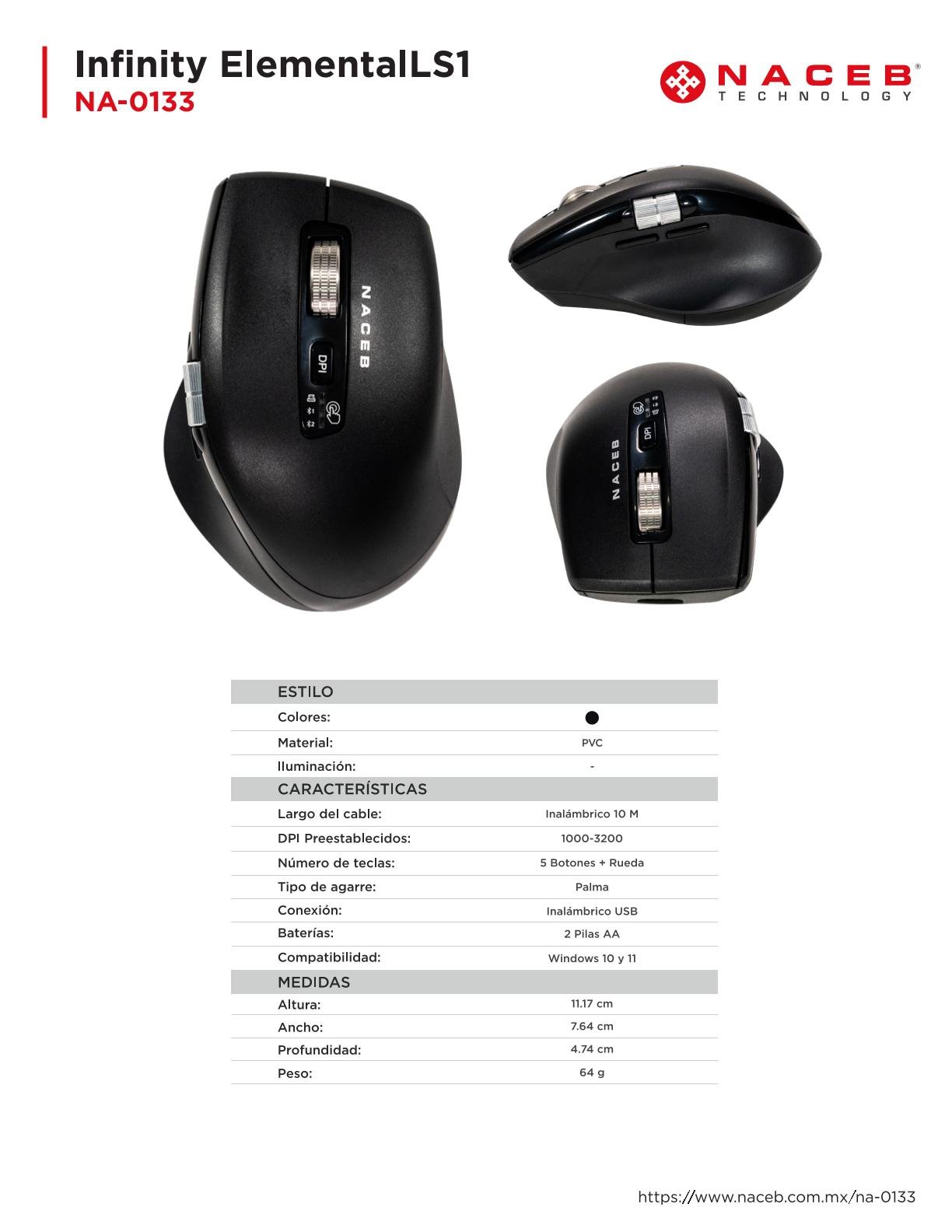 Mouse Naceb Infinity Confort CS1 – Inalámbrico, Óptico, 3200DPI, Nano USB-A, 2 Pilas AA, 5 Botones, Negro