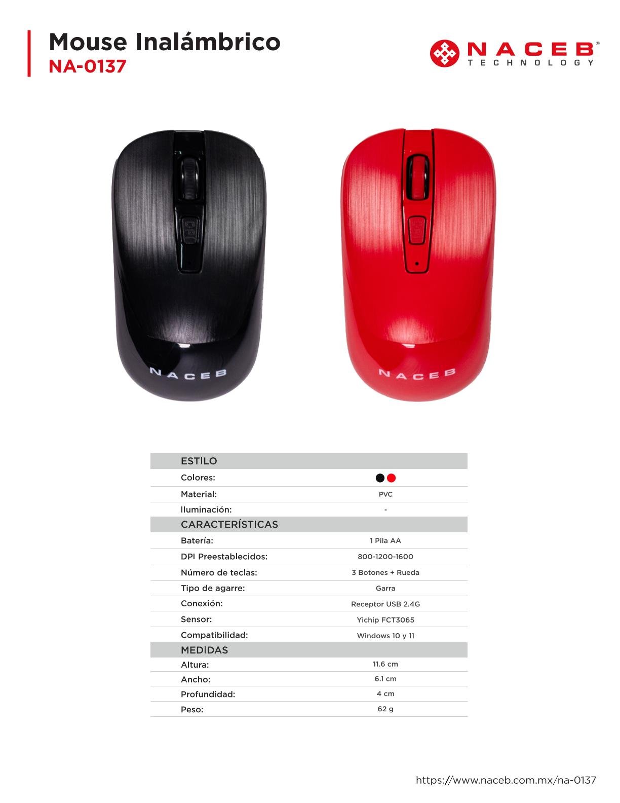 Mouse Naceb NA-0137R – Inalámbrico, Óptico, 1600DPI, RF Inalámbrico, Nano USB, 3 Botones, 1 Pila AA, Rojo