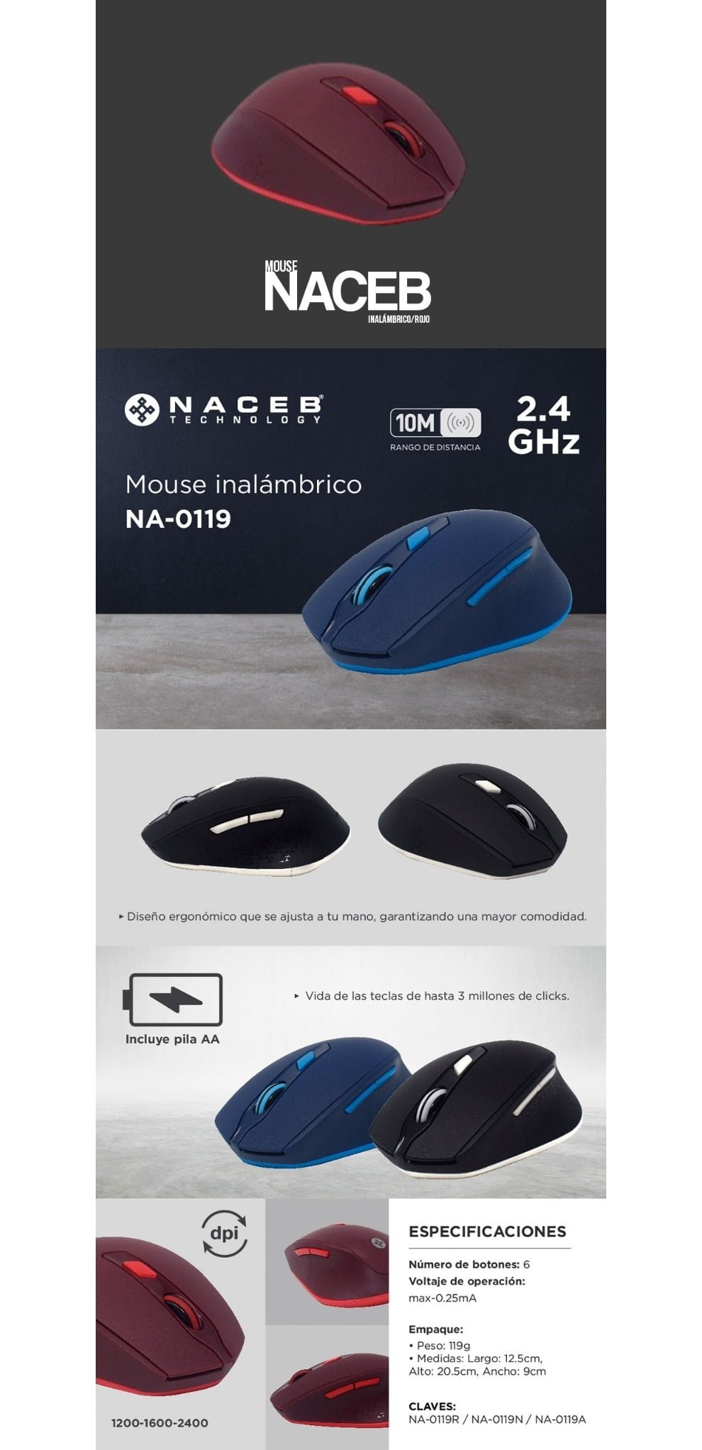 Mouse NACEB TECHNOLOGY NA-0119 / Inalámbrico / Receptor USB / Ergonómico / 2400 DPI / 6 Botones / Sensor Óptico / Rojo