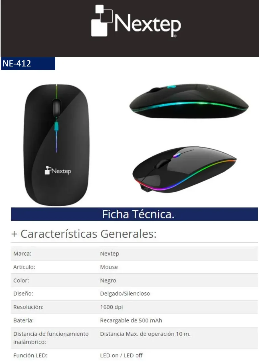 Mouse NEXTEP RGB NE-412N / Inalámbrico / Receptor USB / Delgado-Silencioso / 1600 DPI / Sensor Óptico / Color Negro