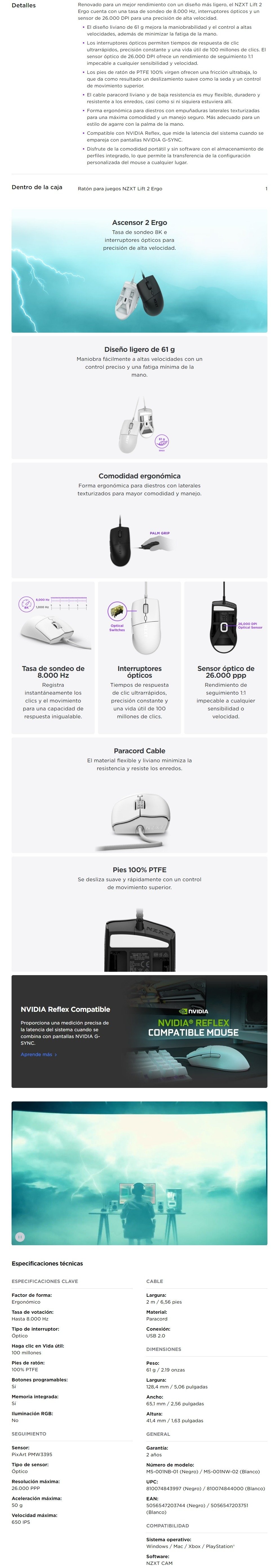 Sé el primero en valorar “Mouse NZXT LIFT 2 ERGO / Alámbrico / Sensor PixArt PMW3395 / Ergonómico / 100 Millones de clicks / 26,000 DPI / Interruptores Ópticos / NVIDIA Reflex Compatible / Blanco”