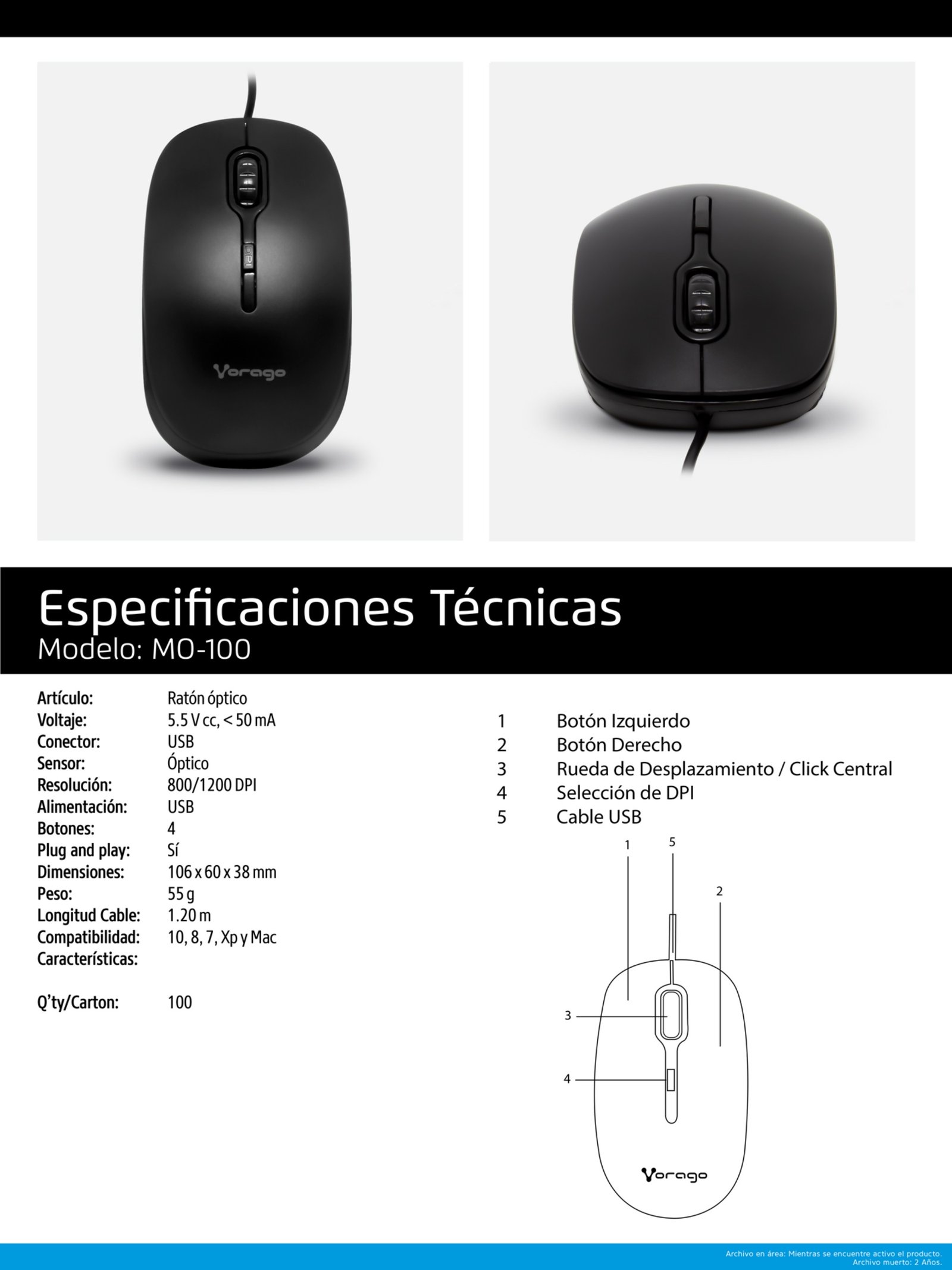 Mouse Óptico VORAGO MO-100 / 1200 DPI / 4 Botones / Alámbrico / USB Tipo A / Cable 1.2 m / Ambidiestro / Sensor Óptico / Negro