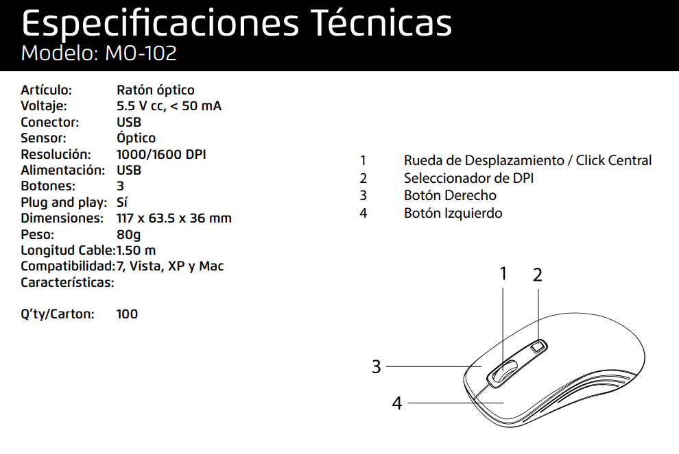 Mouse Óptico VORAGO MO-102 / Alámbrico / USB / 1600 Dpi / Usb 2.0 / Español / Negro