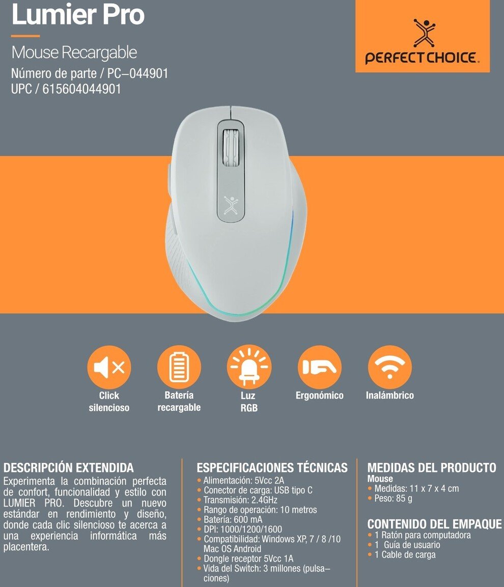 Sé el primero en valorar “Mouse PERFECT CHOICE LUMIERE PRO / Inalámbrico / Ergonómico / USB / USB-C / Recargable / 1600 DPI / 6 Botones / Sensor Óptico / Iluminación / Blanco”