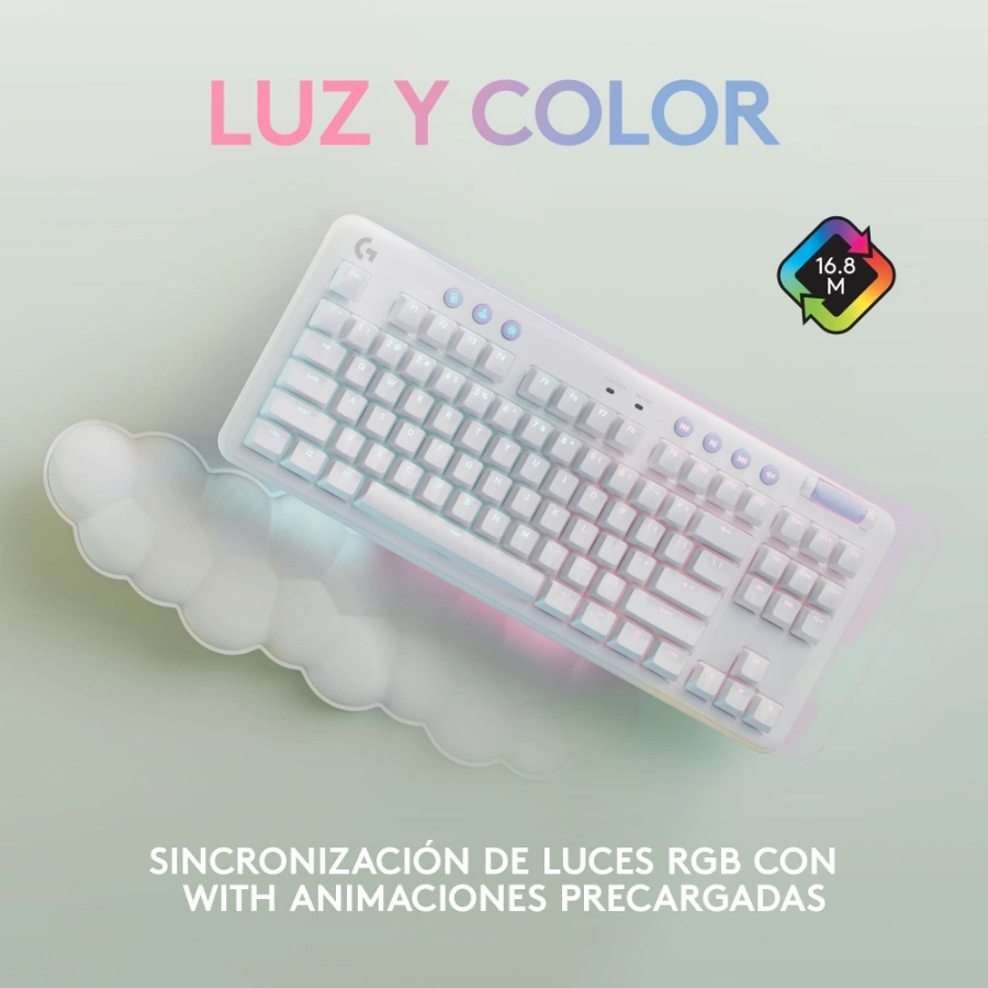 De The Aurora Collection, el G715 es un teclado inalámbrico LIGHTSPEED y Bluetooth® para juegos diseñado para ofrecer confort con el mullido reposamanos incluido. Totalmente equipado con iluminación RGB y los interruptores mecánicos GX que tú elijas. Disponible en Blanco White Mist. Accesorios de combinación de colores a la venta por separado.