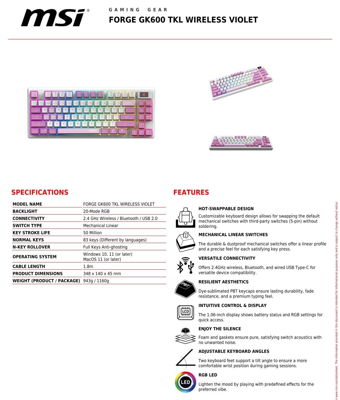 Teclado Gamer Mecánico MSI FORGE GK600 TKL – Inalámbrico Y Alámbrico, RGB, Compacto 65, Control Y Pantalla Intuitivos, Inglés, Violeta