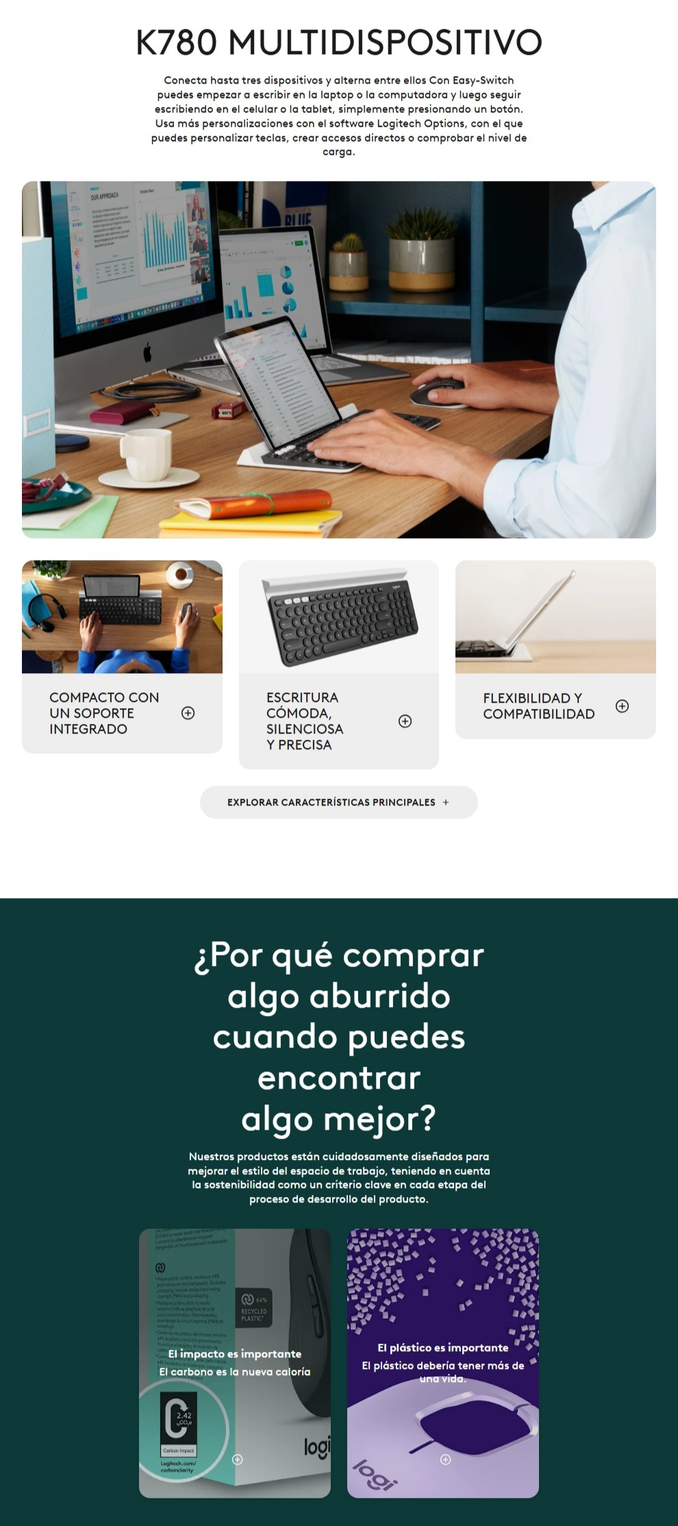 Te presentamos el K780, un teclado compacto diseñado para nuestra época multitarea. Compatible con hasta tres dispositivos, puedes alternar el uso del celular, la tablet y la computadora con un sencillo procedimiento.