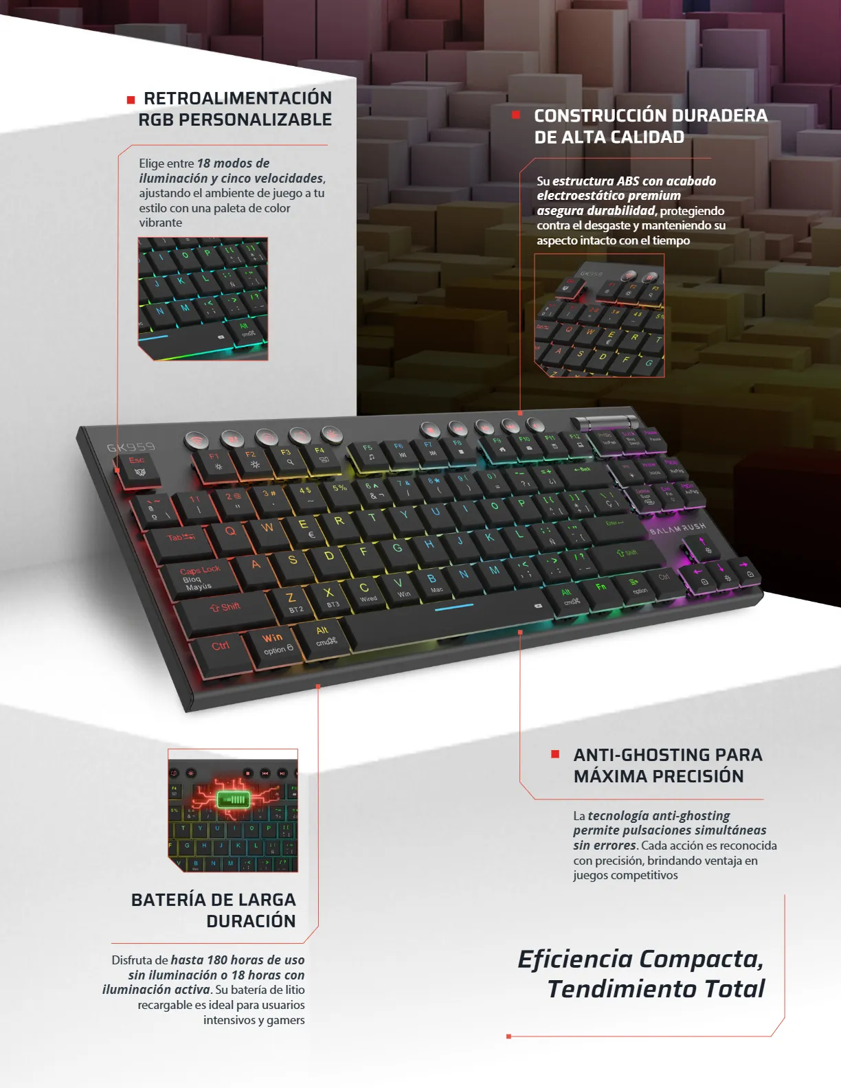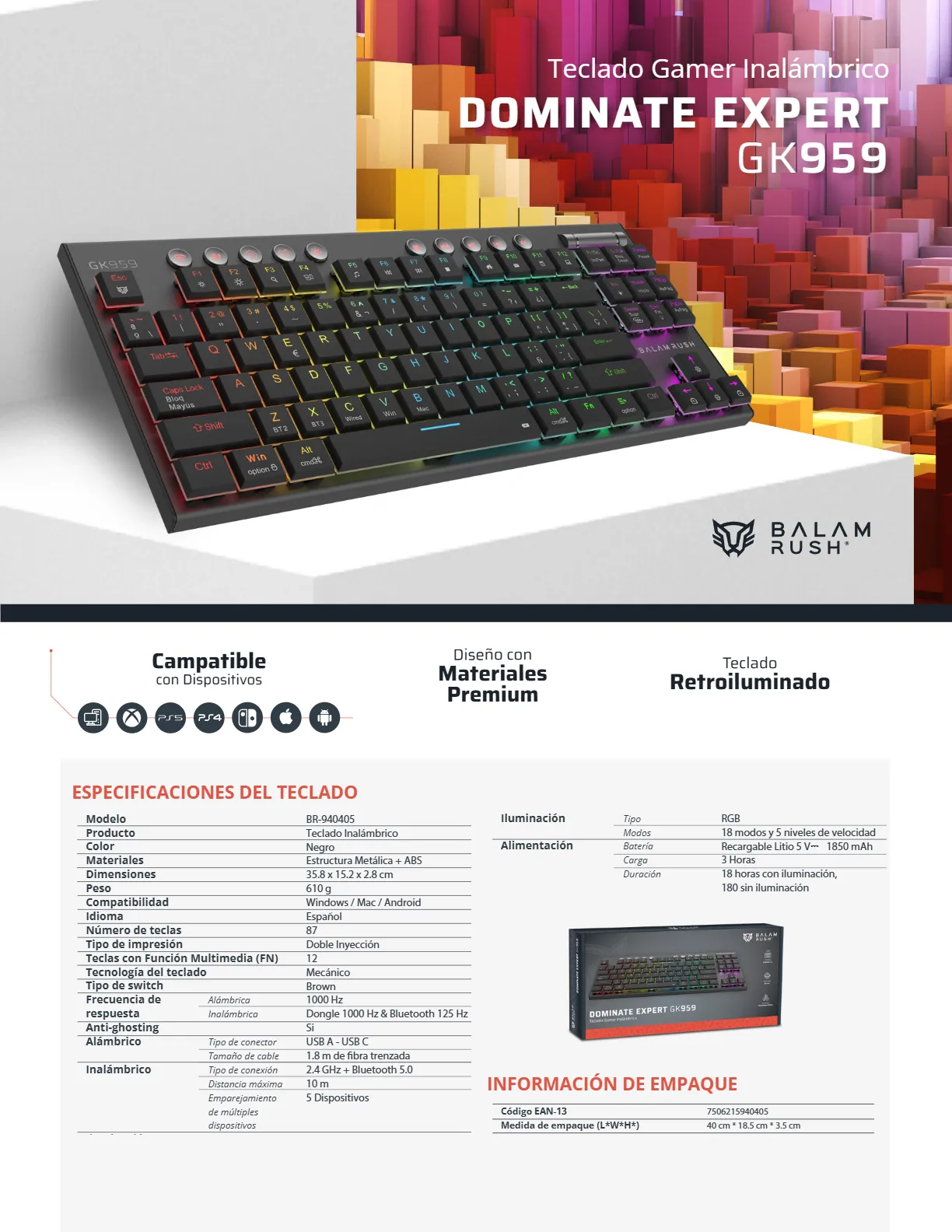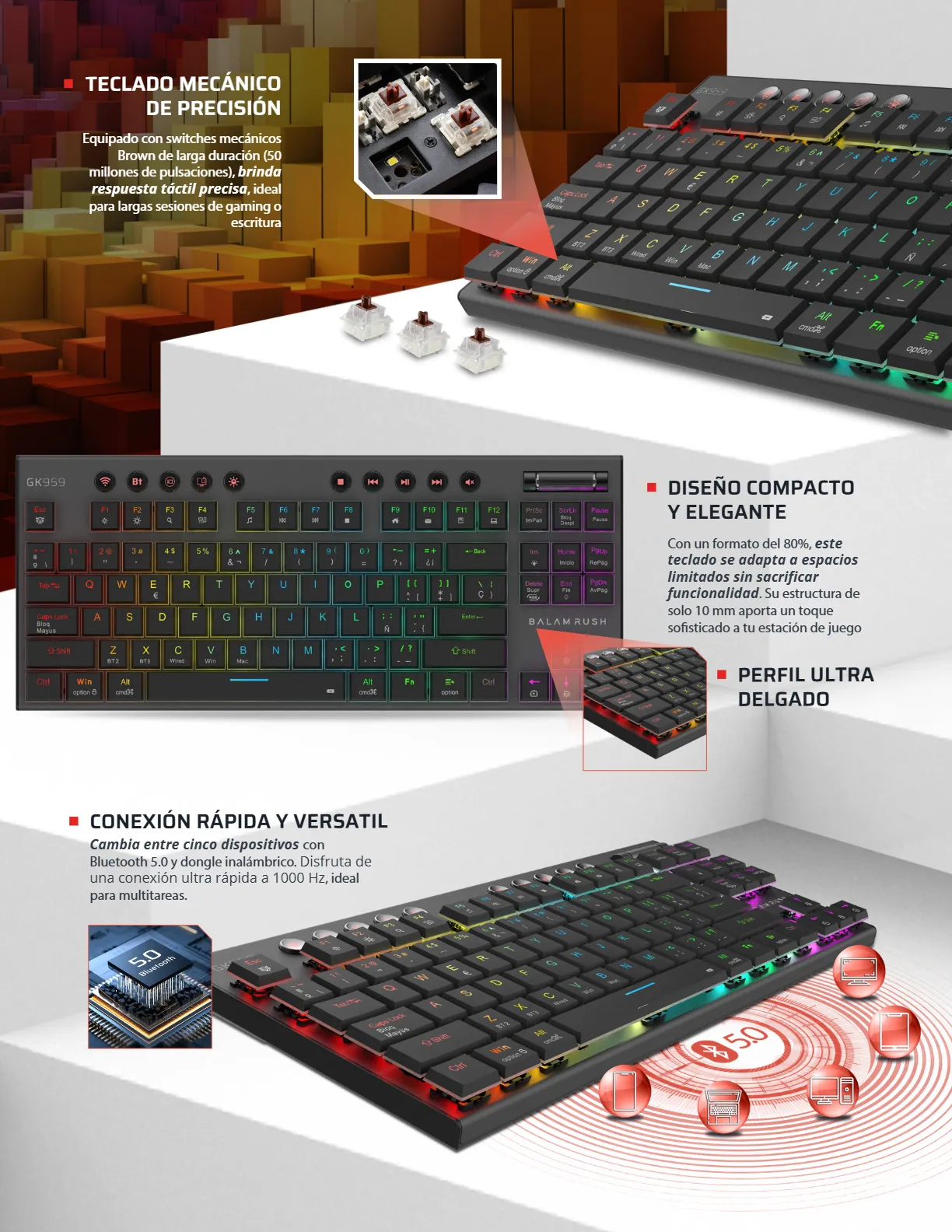 Teclado Mecánico BALAM RUSH DOMINATE EXPERT GK959 – Inalámbrico, Bluetooth, Switch Brown, RGB, Windows, Mac, Android – Color Negro