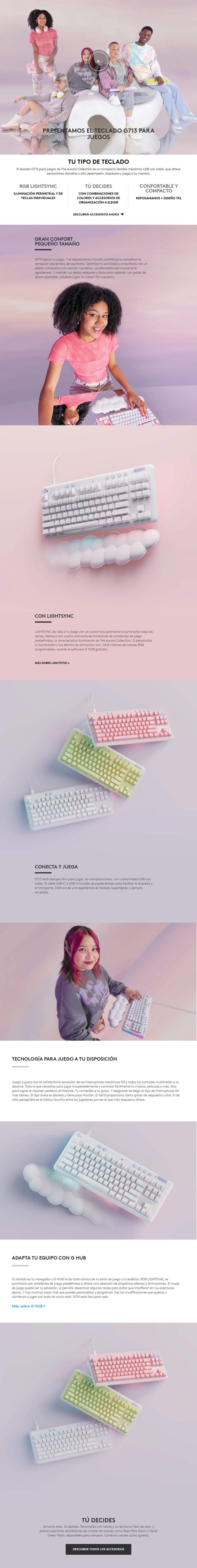 De The Aurora Collection, el G713 es un teclado con cable, compacto, sin sección numérica, diseñado para ofrecer confort con el mullido reposamanos incluido. Totalmente equipado con etérea iluminación RGB y los interruptores mecánicos GX que tú elijas. Disponible en Blanco White Mist. Accesorios de combinación de colores a la venta por separado.
