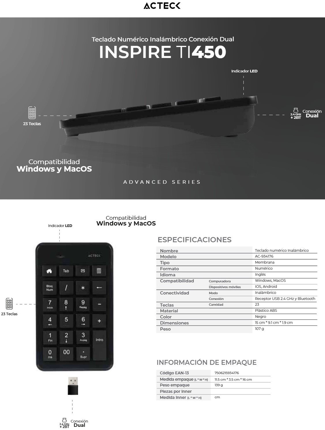 Teclado Numérico ACTECK INSPIRE TI450 / Inalámbrico / Indicador LED / USB / Membrana / 23 Teclas / Color Negro