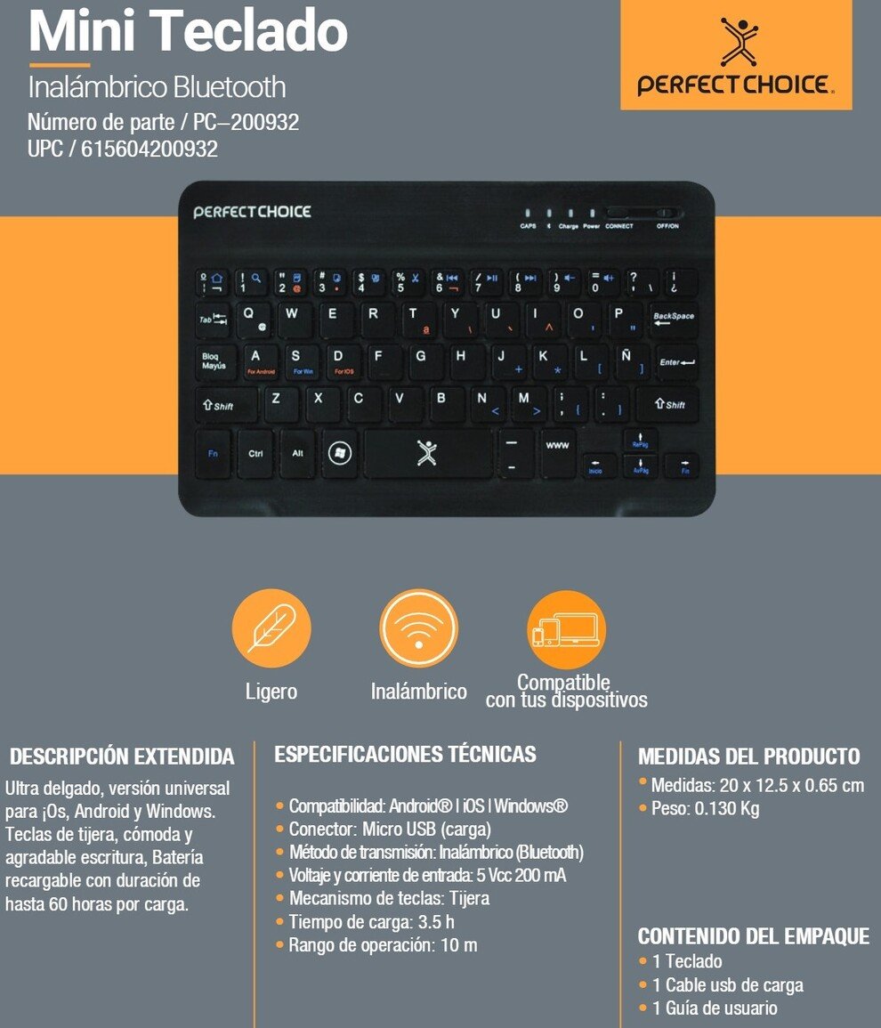 Teclado PERFECT CHOICE PC-200932 / Inalámbrico / Bluetooth / 59 Teclas / Teclas Multimedia / Recargable / Compatible Con Android Y iOS / Español / Color Negro