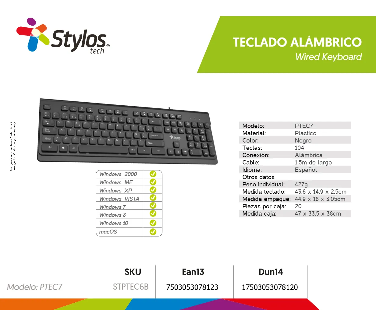 Teclado STYLOS STPTEC6B Ergonómico – Alámbrico USB, Membrana, 104 Teclas, Cable 1.5Metros, Color Negro