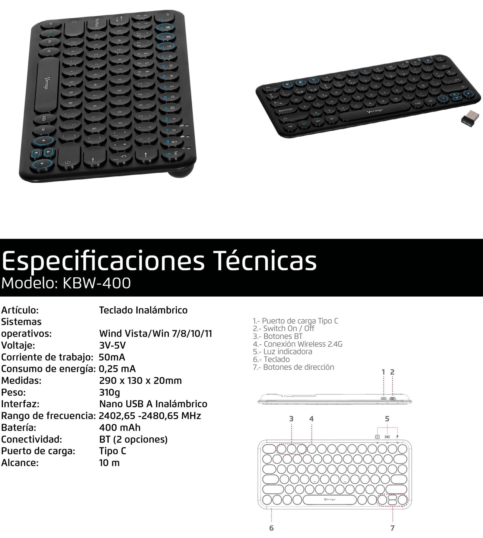 Teclado VORAGO KBW-400 / Inalámbrico / Interfaz Nano USB / 78 Teclas / Español / Negro