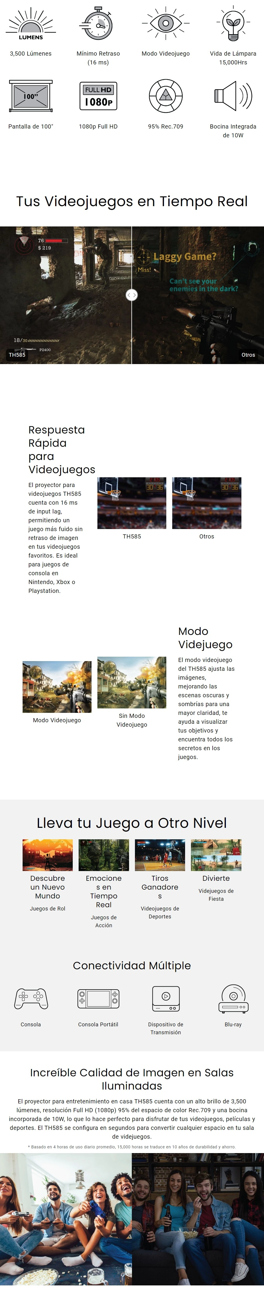 El proyector gaming TH585 de BenQ para entretenimiento en casa, ofrece una calidad de imagen Full HD 1080p, brillo de 3,500 lúmenes con modos especializados para videojuegos y entretenimiento.