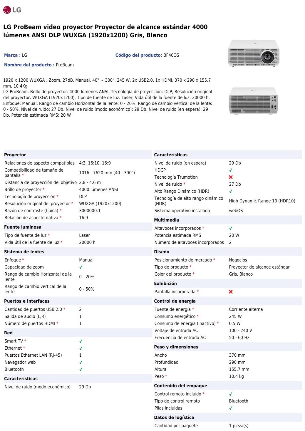 Proyector LG ProBeam / 4000 Lúmenes ANSI / Resolución WUXGA 1920 X 1200 / X1 HDMI, X2 USB 2.0, RJ-45 / Bluetooth / Blanco
