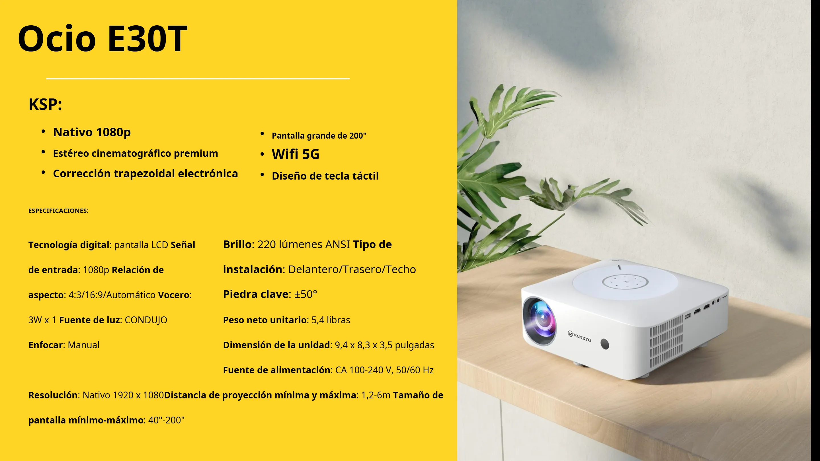 • Full HD nativo 1080P, imagen impresionante: resolución nativa de 1920 * 1080, 220 lúmenes, junto con el motor de color avanzado y la tecnología de luz LED alemana avanzada.